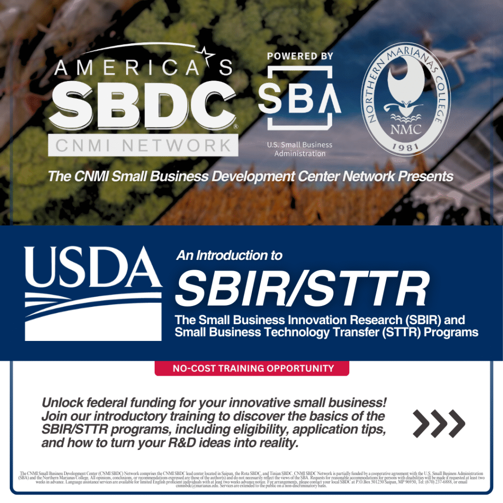 The CNMI Small Business Development Center Network, in collaboration with the Tinian SBDC and Rota SBDC, and in partnership with the U.S. Department of Agriculture, is excited to host a series of introductory training sessions to provide a more in-depth presentation and discussion related to the SBIR/STTR programs funded under the USDA. The USDA is one of eleven agencies with direct access to SBIR/STTR funding.