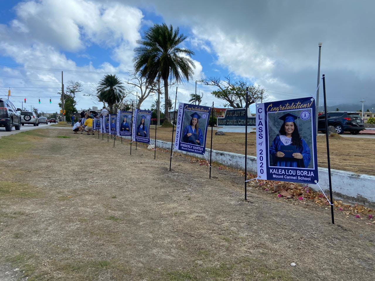 Project Familia’s graduation banners for Mount Carmel School seniors went up on Saturday with the assistance of AlumKnights, MCS faculty, staff, parents, and student volunteers. Dr. Galvin Deleon Guerrero, president of Mount Carmel School and Class of 1991 AlumKnight, said: “I cannot thank Mount Carmel School’s 1990 AlumKnights and Project Familia enough for this beautiful way to recognize our graduates of the Class of 2020 and much thanks to the MCS faculty and staff that showed up to lay these banners out.” Project Familia photo