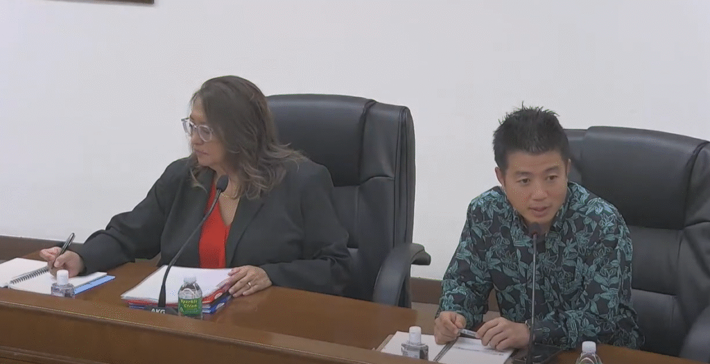 Brian Shin, right, the president and chief executive officer of E-Land Group’s Micronesian Resort Inc., and Gloria Cavanagh, the acting vice president of E-Land, attend a meeting with the Senate Committee on Resources, Economic Development, Programs & Gaming and the Department of Public Lands in the Senate chamber on Friday.