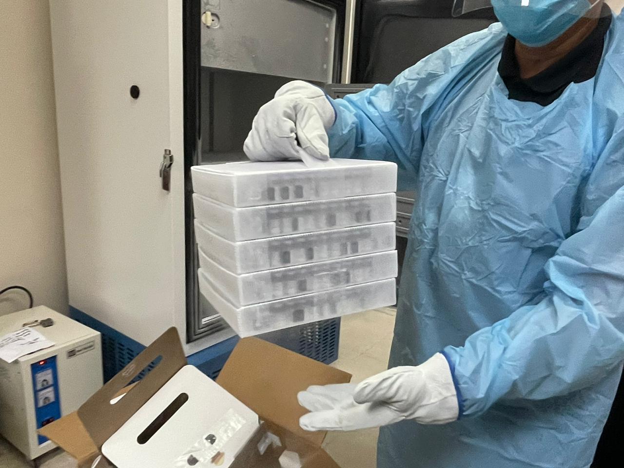 A Commonwealth Healthcare Corp. staff member unloads a box of newly arrived Covid-19 vaccine shots at the hospital Thursday morning.