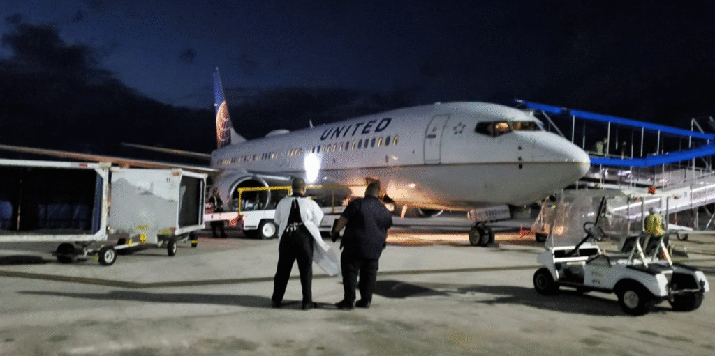 Customs personnel stand by as the first shipment of the Covid-10 vaccine is  unloaded from a United Airlines aircraft at the Francisco C. Ada/Saipan International Airport at 5:30 a.m. Thursday.