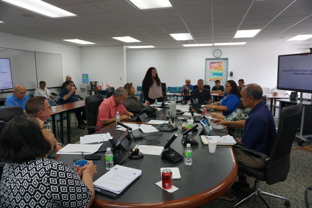 Commonwealth Utilities Corporation engineer Yvonne Ogumuro, standing, presents CUC’s proposed Five-year Energy Action Plan during the CUC board of directors’ regular meeting on Wednesday, March 27. Also in photo are CUC board chair Janice Tenorio, CUC board members Don Browne, Frank Rabauliman, Simon Sanchez, Rebecca White, Valerie Atalig (partially hidden), CUC acting Executive Director Betty Terlaje, and Andrew Reyes CUC renewable energy engineer.