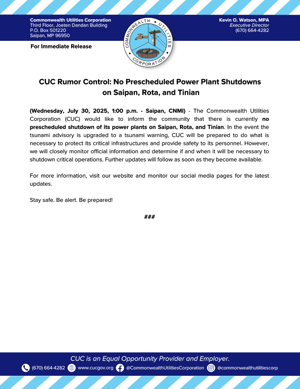 CUC rumor control: No prescheduled power plant shutdowns on Saipan, Rota, and Tinian