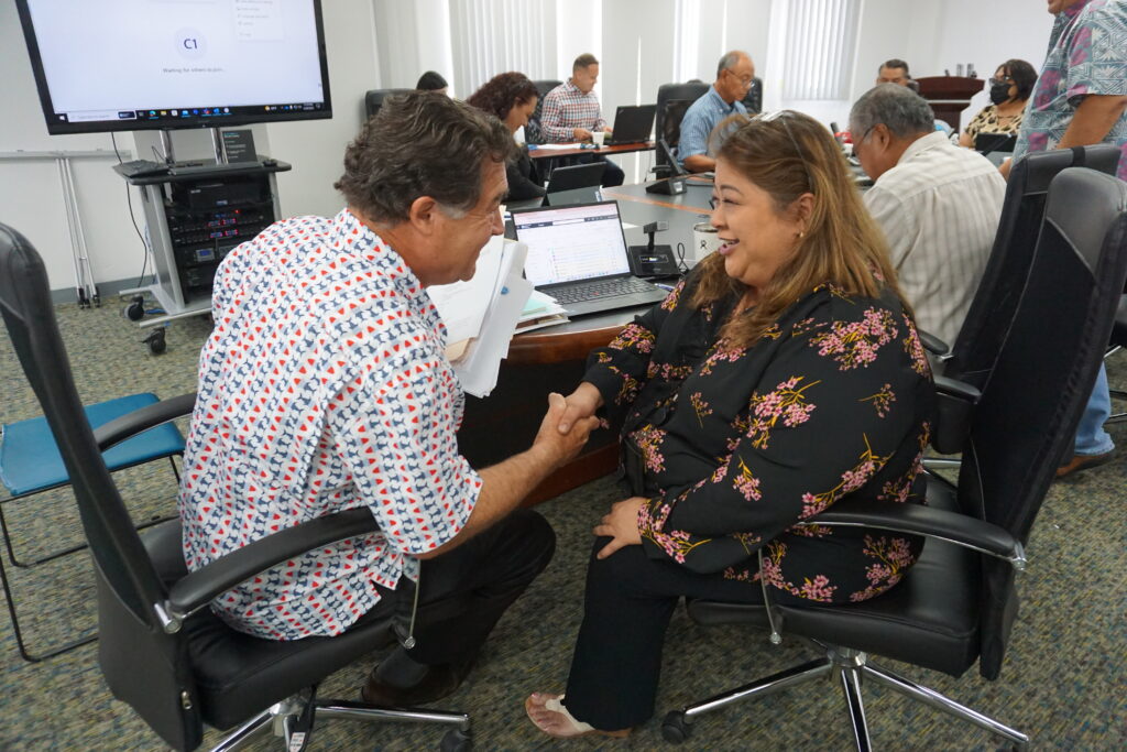 Acting Commonwealth Utilities Corp. Executive Director Betty Terlaje, right, shakes hands with Kevin Watson after the CUC board of directors unanimously offered him the executive director’s job on Thursday.