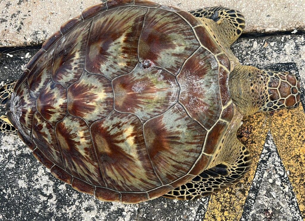 The turtle was first spotted upside down on the surface of the water, he added. It was later learned that the turtle’s shell was pierced with a spear from a speargun.