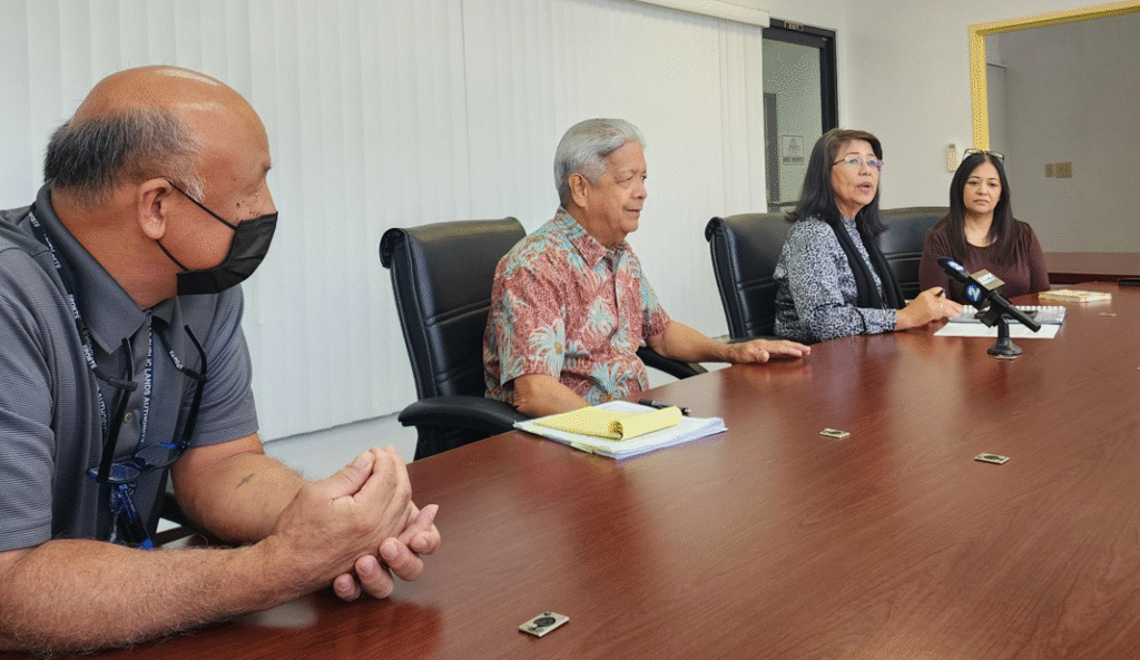 From left, Department of Public Lands-Compliance Division Director Gregory Deleon Guerrero, special advisor David Sablan, DPL Secretary Teresita A. Santos, and DPL-Real Estate Division Director Boni Royal meet with reporters on Wednesday morning in the DPL conference room.