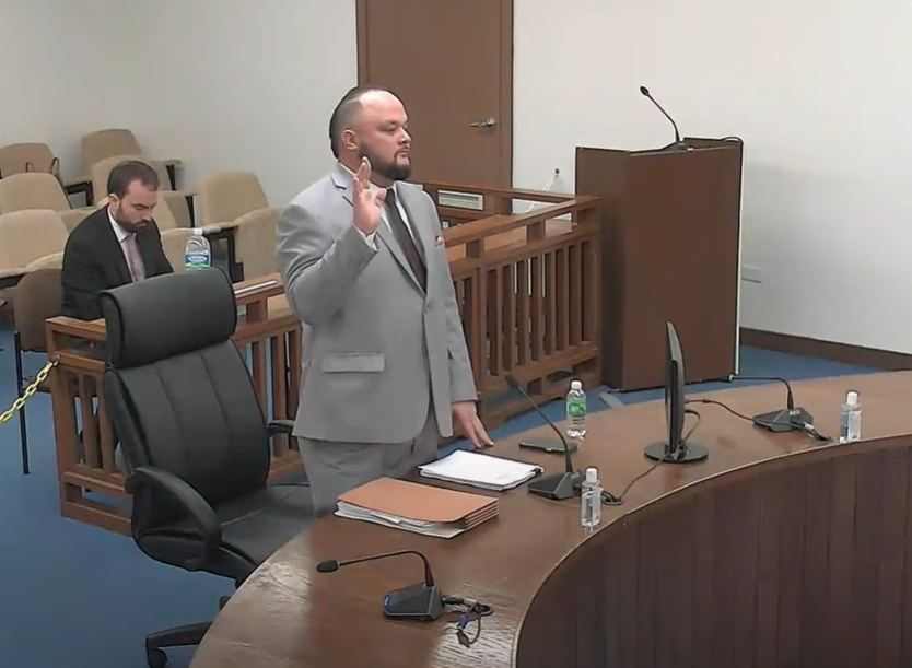 Shayne Villanueva is sworn in by a House special committee during a meeting in the House chamber on March 5, 2024.