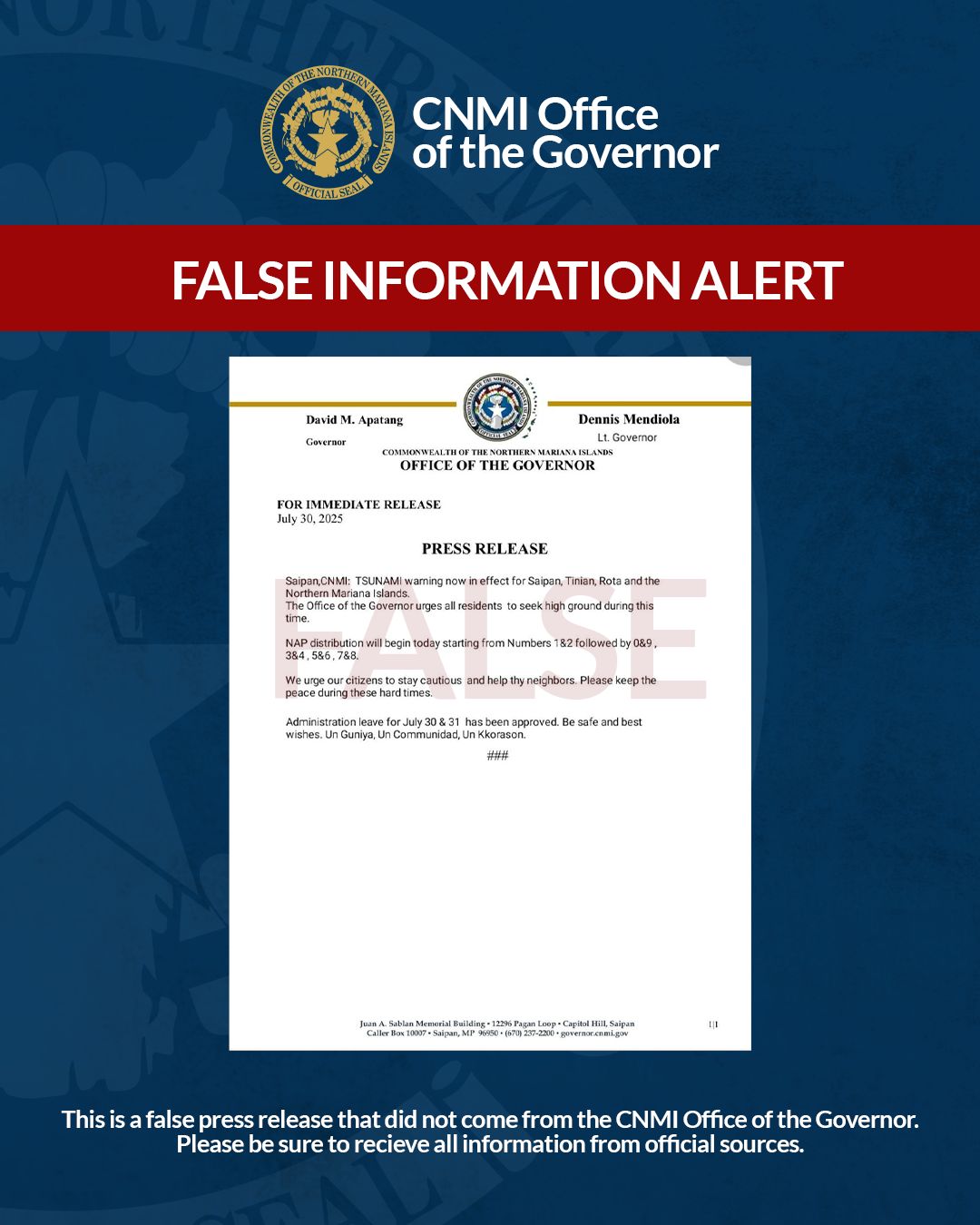 THE CNMI Office of the Governor has received word of a FALSE press release circulating in social media.