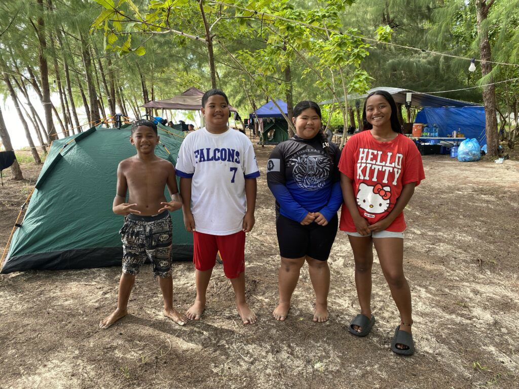 Aschuupi Lisua of San Vicente Elementary School, Ezekiel Taman of Kagman Elementary School, Riri Lisua of Oleai Elementary School, and Kyuwi Lisua of Dandan Middle School pose for a photo outside the tent where dozens of baby turtles were seen scuttling across their campsite.
