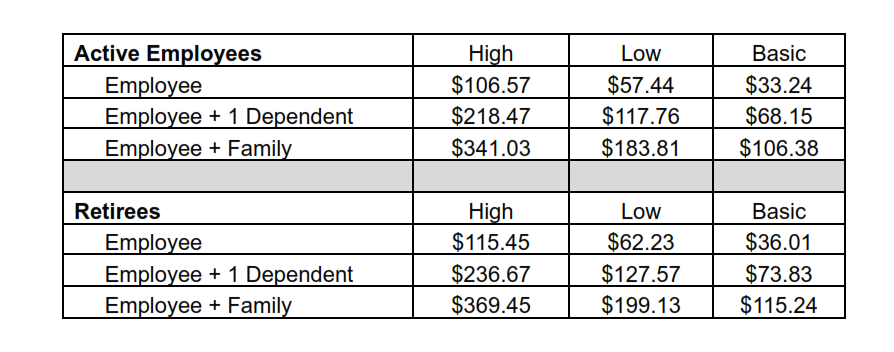 The  premium  rates reflect  an  increase  from  previous  years’  rates  and  are  specified for individual employees, employees with dependents, and coverage for employees and their families. Government employees are encouraged to review the different options that are available so that they can sign up or modify their insurance coverage during the open enrollment period.