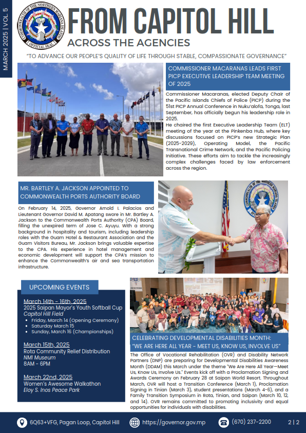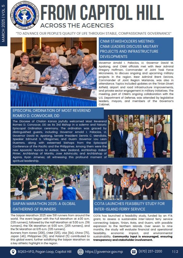 • Major Infrastructure & Military Projects – Updates from CNMI leaders’ discussions with military officials on the Tinian Divert Airfield, road improvements, and private sector engagement
