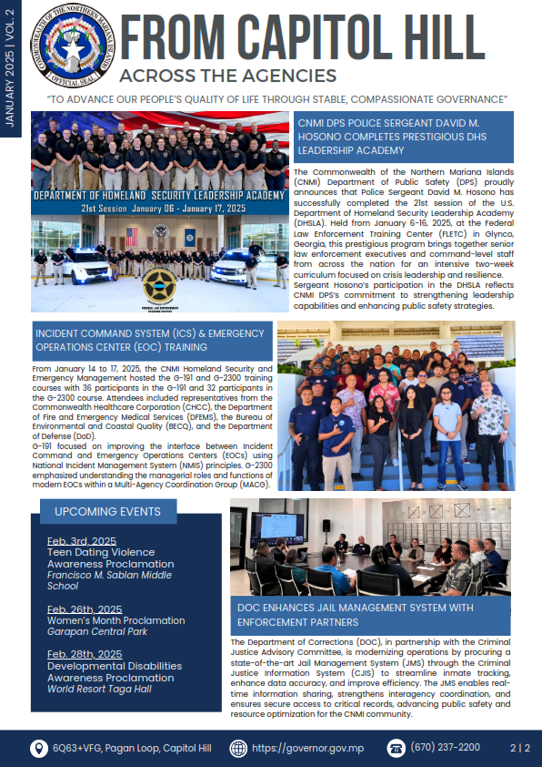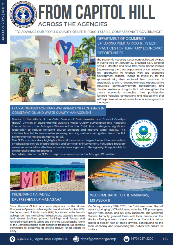 Dive into the latest news featuring updates from the Department of Commerce, Department of Public Lands, Marianas Visitors Authority, Department of Corrections, and the CNMI Homeland Security & Emergency Management. Stay informed on the policies and progress shaping our islands. Go to https://governor.gov.mp/news/from-capitol-hill-across-the-agencies-volume-2/.