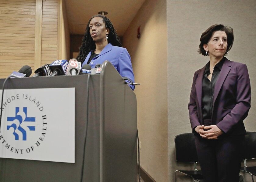 Rhode Island Director of Health Nicole Alexander-Scott, left, and R.I. Gov. Gina Raimondo, right, face reporters during a news conference, Sunday, in Providence, R.I. Alexander-Scott took questions on what she described as the state’s first presumptive positive case of coronavirus. Officials said the person is in their 40s and had traveled to Italy in February of 2020. AP