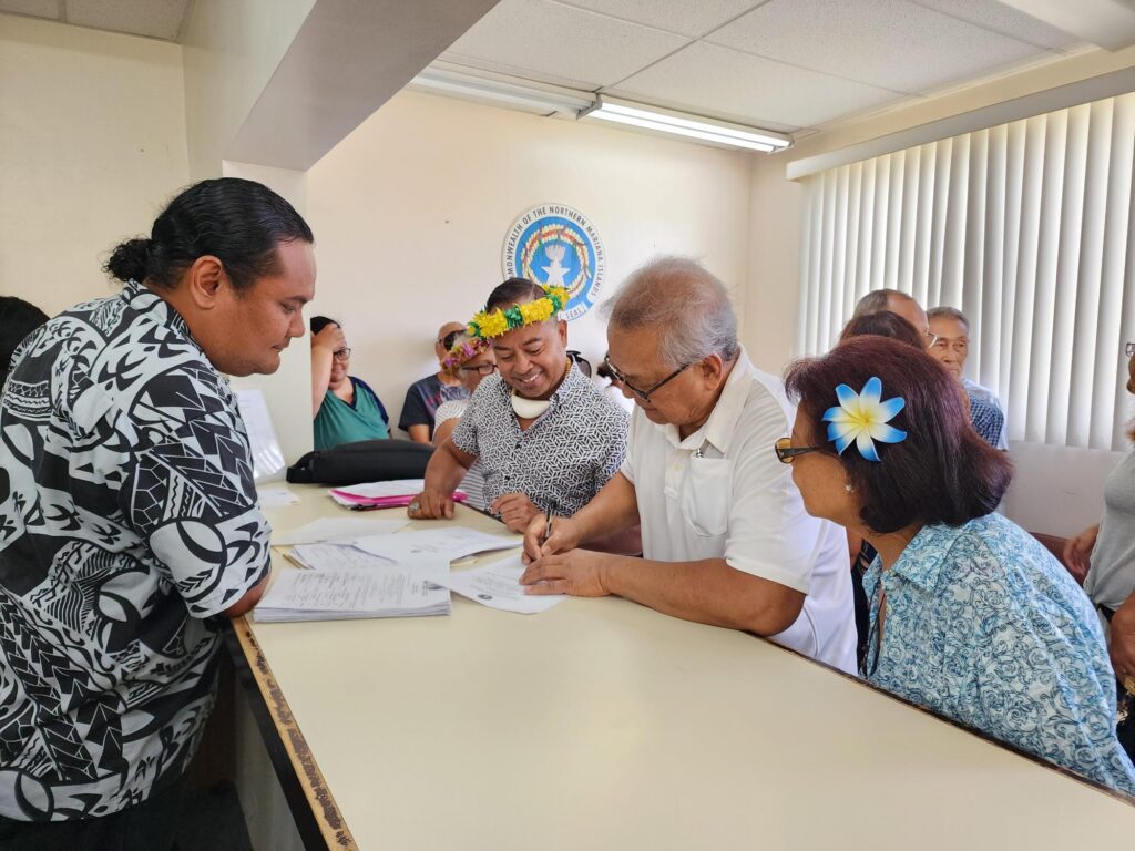 John Oliver Delos Reyes Bolis Gonzales smiles as former Rep. Ray Basa, co-vice chairman of the Committee to Elect Gonzales, signs election commission documents while Ignacia I. Piteg and CEC administrative officer AJ Lisua look on.