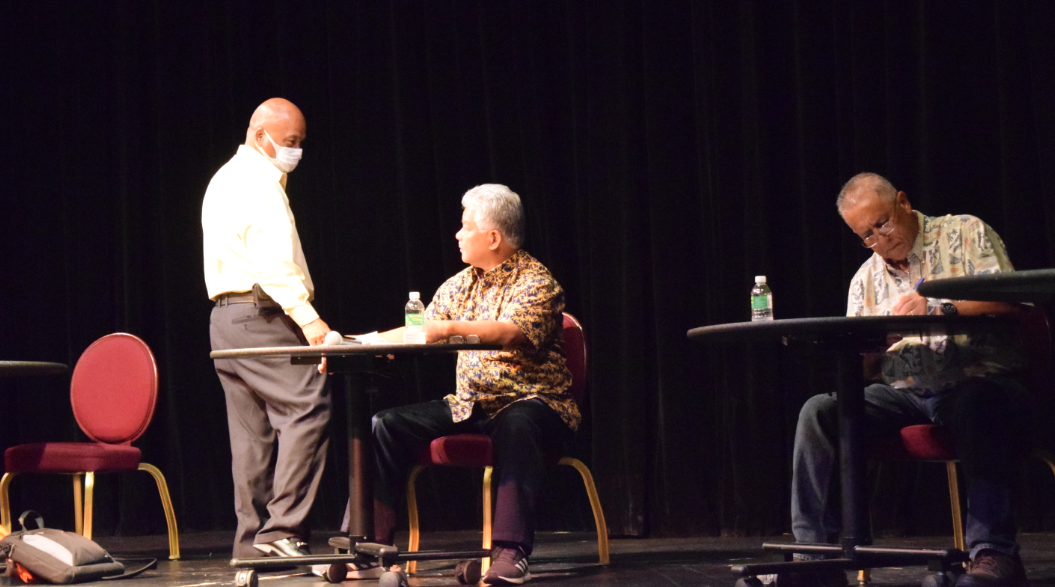 Sen. Sixto Igisomar, left, talks with Lt. Gov. Arnold I. Palacios, seated, while Rep. Leepan Guerrero, right, reads a document during the Saipan Chamber of Commerce townhall meeting in the ballroom of the Hyatt Regency Saipan on Wednesday. Photo by Emmanuel T. Erediano