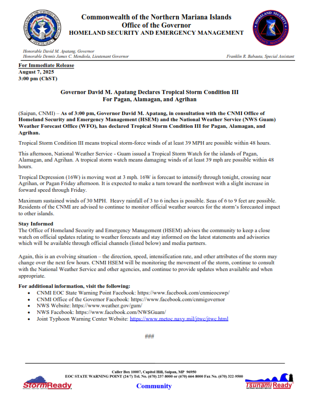 Governor declares Tropical Storm Condition III For Pagan, Alamagan, and Agrihan