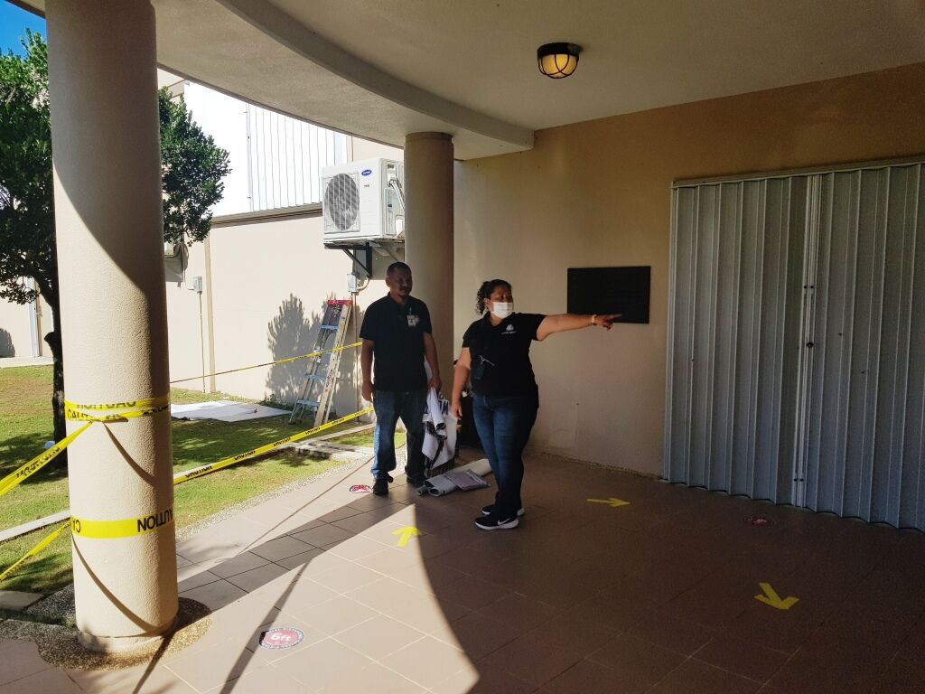 At the Kagman Community Center, election commission staffers install signs to comply with the Covid-19 prevention measures. Photo by Bryan Manabat