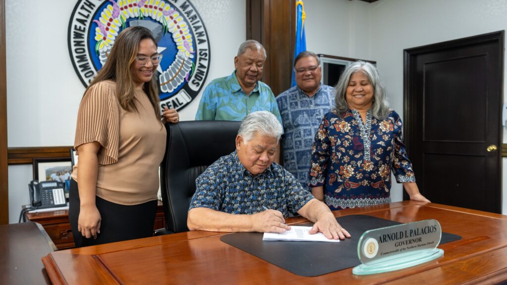 Gov. Arnold I. Palacios signs the government’s fiscal year 2025 budget measure as Lt. Gov. David M. Apatang, Finance Secretary Tracy B. Norita, Special Assistant for Management and Budget Vicky Villagomez and OMB Budget Officer Edward Tenorio look on in the governor’s conference room on Capital Hill, Monday.