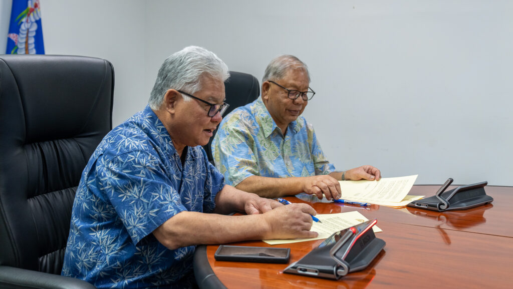 Gov. Arnold I. Palacios and Lt. Gov. David M. Apatang sign the official proclamation for Digital Inclusion Week on Sept. 27, 2024.