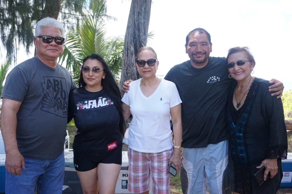 Gov. Arnold I. Palacios, left, and first lady Wella S. Palacios, center, with relatives Becky Cruz, right, Becky Lynn C. Lizama, second left, and her husband, Wilfred Q. Lizama, second right, during a family gathering at the Civic Center on Sunday.