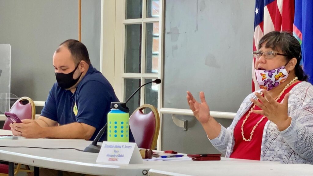 Sinajana Mayor Robert Hofmann, left, listens as Mayors’ Council of Guam President Melissa Savares, mayor of Dededo, addresses mayors during a council meeting on Nov. 10, in Sinajana. Photo by Haidee Eugenio Gilbert/The Guam Daily Post