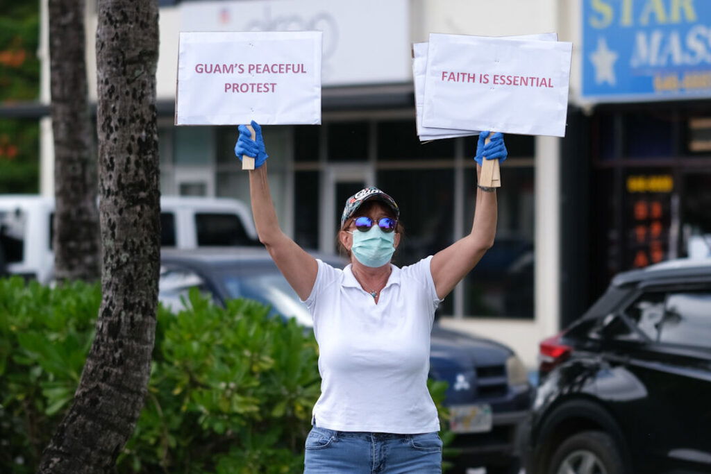 A woman holds signs on San Vitores Road in Tumon last week as she joins other residents protesting the stay-at-home order issued by Guam Gov. Lou Leon Guerrero. Photo by Norman M. Taruc/ The Guam Daily Post