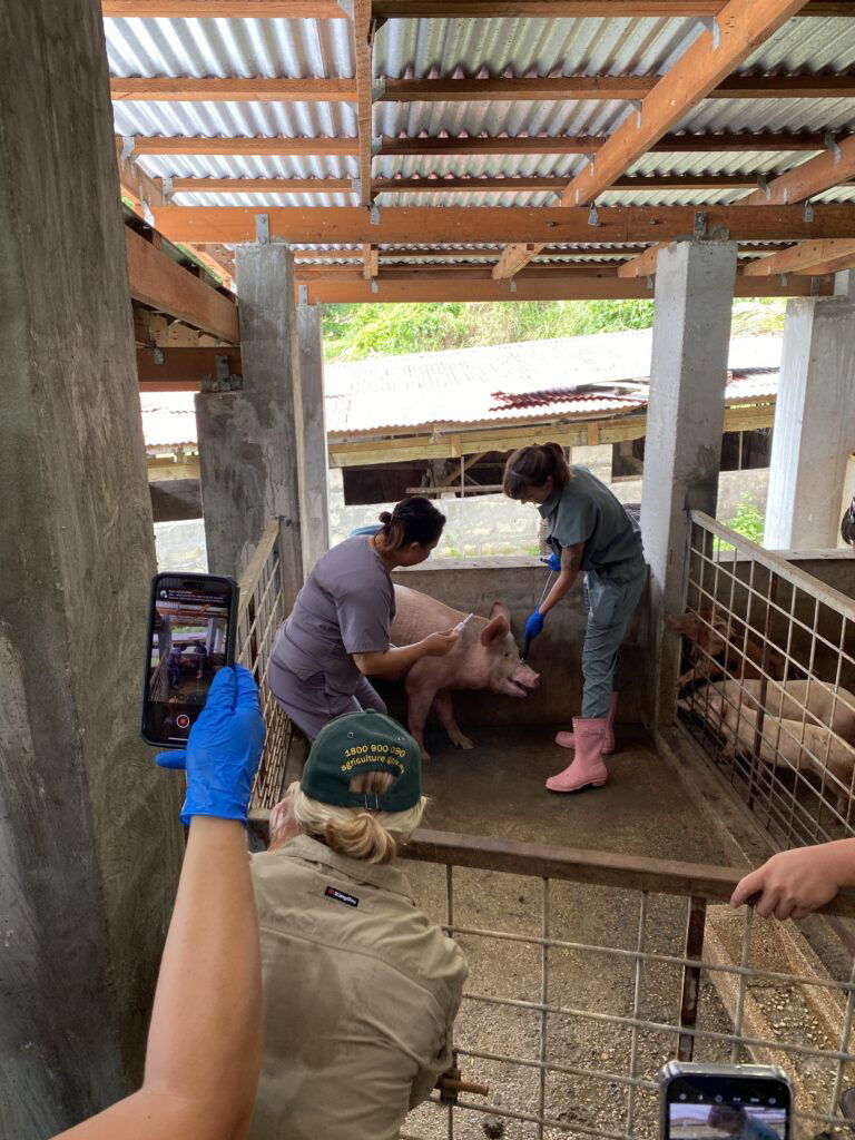 A trainer from Australia’s Department of Agriculture, Fisheries and Forestry demonstrates how to draw blood from pigs.