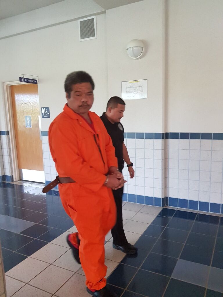Sylvestre Rogopes Sablan is escorted by a Corrections officer in the hallway of the judicial building on Jan. 3, 2018. Photo by Bryan Manabat