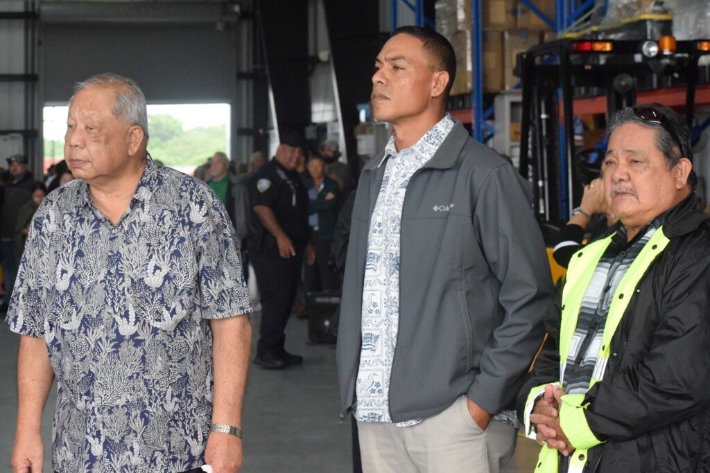 Former Rep. Edwin Propst, Rep. Blas Jonathan Attao and Speaker Edmund S. Villagomez at the hangar of Micronesian Air Cargo Services at the Francisco C. Ada/Saipan International Airport on Saturday.