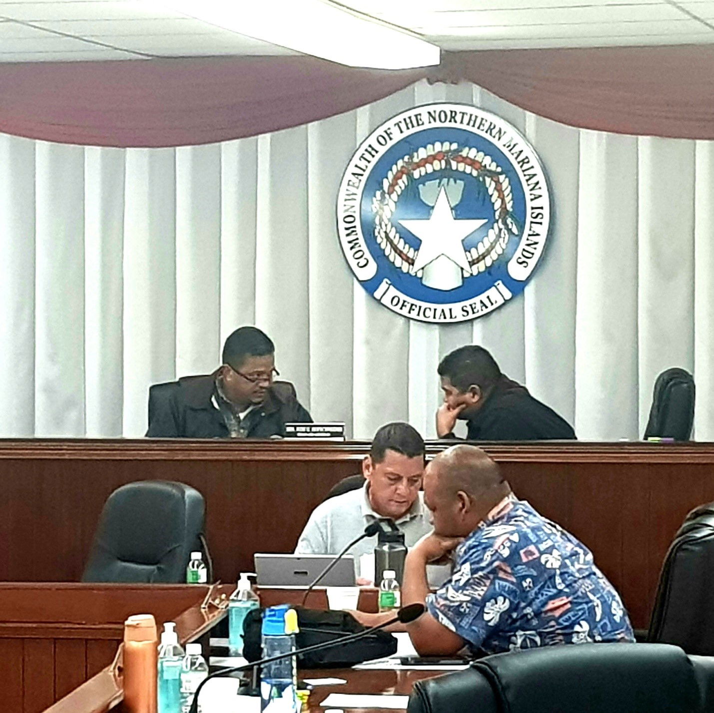 The bicameral conference committee co-chairs, Senate Vice President Jude Hoschneider and Rep. Ivan Blanco, confer during a meeting late Wednesday evening in the Senate chamber. Photo by K-Andrea  Evarose  S. Limol