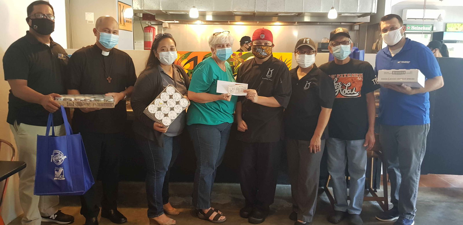 Inas’ Kitchen chef Sonnie Sablan, fourth right, hands a check to Karidat executive director Lauri Ogumoro. Also in the photo are Karidat counselor Elaine Cabrera Dela Cruz, third left, Bishop Ryan Jimenez, second left, Five Star Wholesale general manager Jay Santos, left, Payless SuperFresh general manager Morgan Caricco, right, Chef Sonnie’s parents, Rita Sablan, third right, and Frank Sablan, fourth right. Photo by Emmanuel T. Erediano