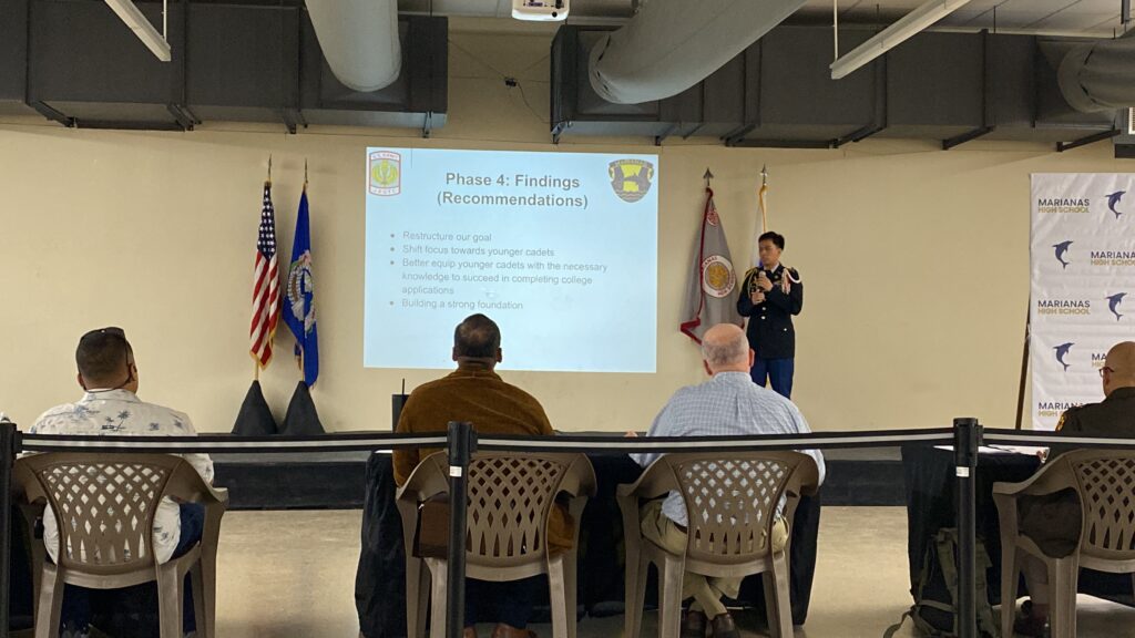 Marianas High School Battalion Commander Paulo Quidato delivers a presentation on Friday, Feb. 2, in the MHS cafeteria.