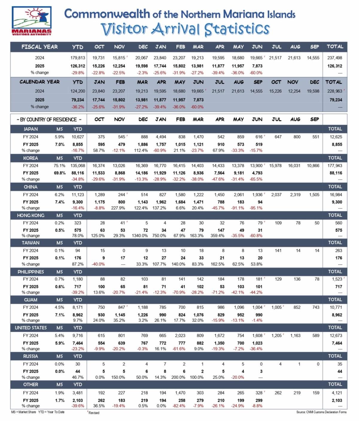 THE Marianas Visitors Authority reports that visitor arrivals to the CNMI totaled 7,873 in June 2025, a 60% decrease compared to 19,665 visitors received in June 2024. So far this fiscal year, visitor arrivals are 30% lower than over the same period last year.
