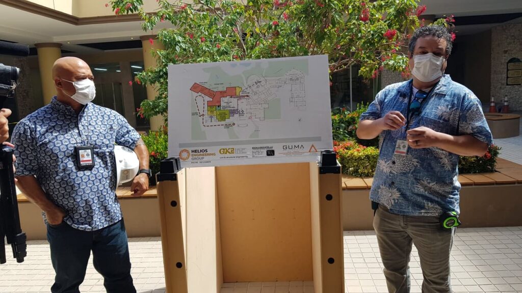 Helios Energy Group president Jesse V. Sablan, left, and Samuel McPhetres of Guma Architects explain to reporters their alternate care site design for Kanoa Resort.