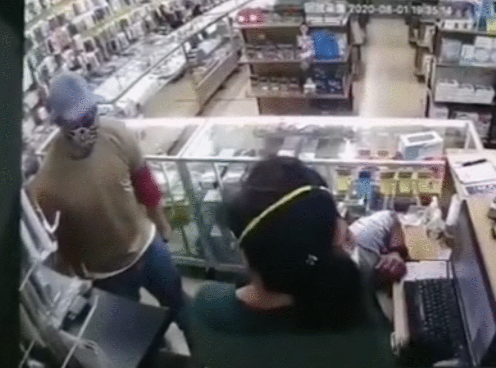 This image from a video clip shows the robber, left, with the I-Zone manager and his wife. Facebook image