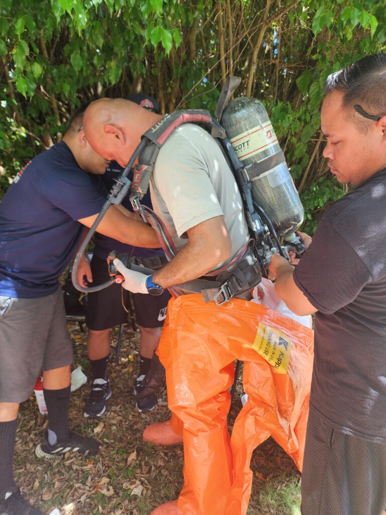 For his part, Department of Fire and Emergency Medical Services Public Information Officer Robert Mojica said, “The responders will go in with level A suits, orange suits. These suits are for training equipment, but we do have actual real-world scenario suits, if needed. They are going to be inside the facility with their full gear, Level A suits, and with what we call SB tanks. Their masks have radios connected outside to the incident command post for communication.”