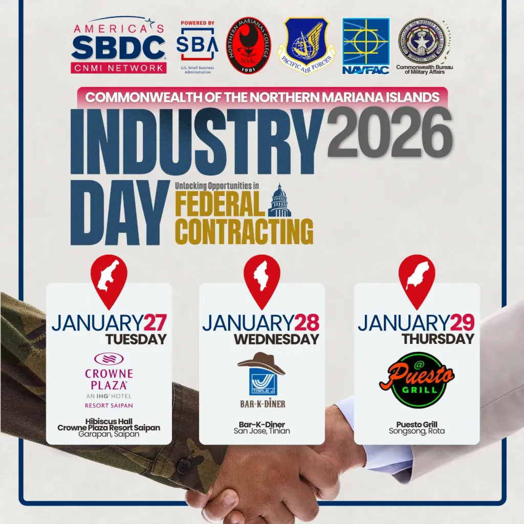 (SBDC) — The CNMI Small Business Development Center Network is pleased to announce the official venues for its 2026 CNMI Industry Day events, returning for its second year with a three-island series designed to connect local businesses with government and military procurement opportunities across the Commonwealth.