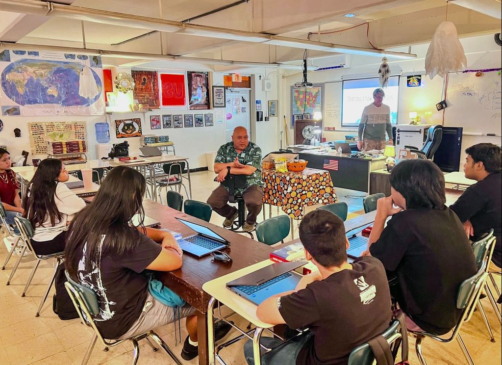 Dr. Lawrence F. Camacho, commissioner of education, spoke with the U.S. Government class of Tinian High School educator Rory Starkey on Wednesday to reaffirm the Public School System’s support for students as they prepare for graduation and life beyond high school.