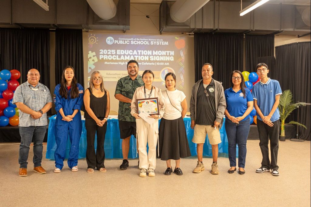 The proclamation signing was held at the Marianas High School cafeteria. Three students led the reading of the proclamation: Oleai Elementary School’s Lucila Bercilla for English, Francisco M. Sablan Middle School’s Keara Crisostomo for Carolinian, and Marianas High School’s Deltona Takai for Chamorro.
