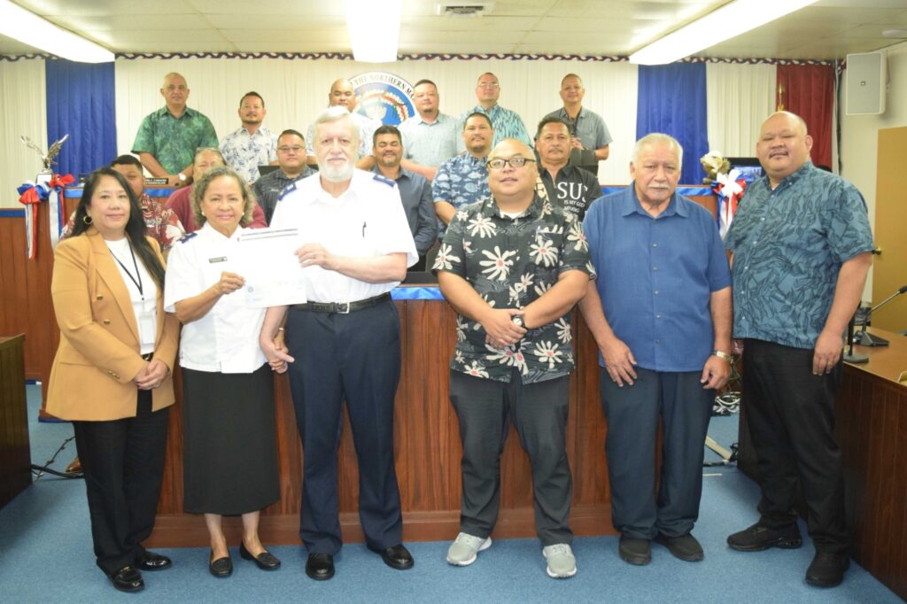 SNILD Chairman Rep. John Paul Sablan gave the check to Salvation Army ministry leader Pastor Wayne Gillespie in the presence of other Saipan lawmakers prior to the delegation session at 10 a.m.