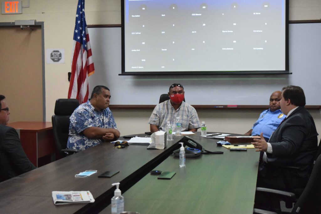 Assistant Attorney General John Lowrey, right, explains his concerns to CNMI Lottery Commission members, Finance Secretary David DLG Atalig, Commerce Secretary Mark Rabauliman and Department of Public Safety Commissioner Robert Guerrero, as Imperial Pacific International Chief Executive Officer Donald Browne, left, listens during a meeting in the Commonwealth Casino Commission conference room on Friday. Photo by Emmanuel T. Erediano