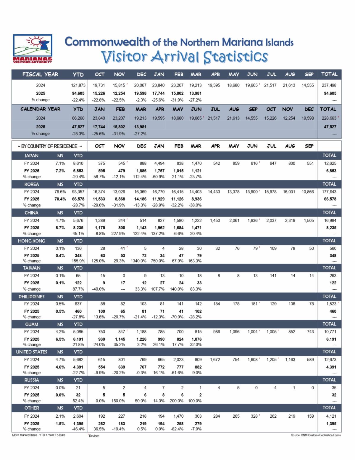 (MVA) — The Marianas Visitors Authority reports that visitor arrivals to Saipan, Tinian, and Rota totaled 13,981 in March 2025, a 27% decrease compared to 19,213 visitors received in March 2024.