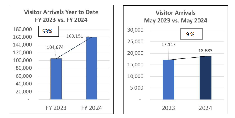 (Marianas Visitors Authority) — Arrivals to Saipan, Tinian and Rota grew 9% to 18,680 visitors in May 2024, compared to 17,117 visitors received in May 2023.  However, monthly arrivals were 51% lower compared to pre-pandemic levels of May 2019, when arrivals reached 38,262 visitors.