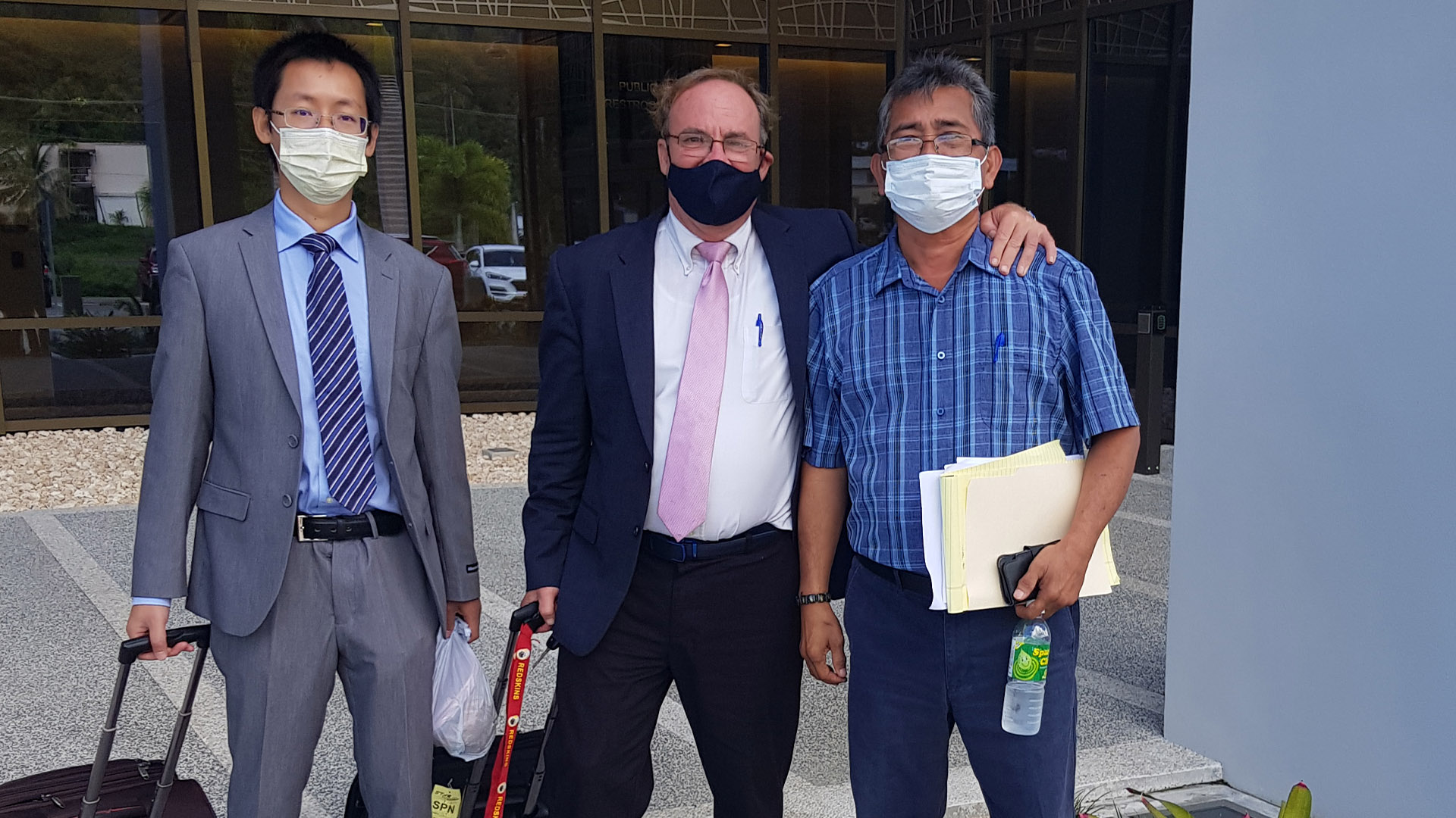 From left, attorneys Cong “Dennis” Nie and David Banes with Rota Mayor Efaim Atalig pose for a photo outside the new federal court building after the hearing on Tuesday. The mayor’s jury trial resumes today, Wednesday, at 9:15 a.m. Photo by Bryan Manabat