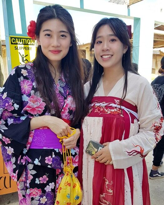 Kate Ishida is dressed in a traditional Japanese costume while Tina Zhen wears a traditional Chinese dress.