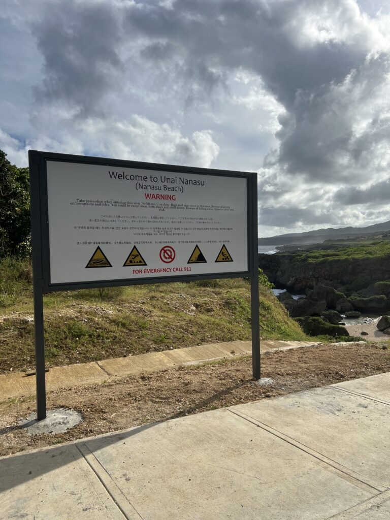 Multi-language safety signs were installed by the Marianas Visitors Authority and the Department of Public Works in January 2024 at Unai Nanasu and Unai Fandang beaches along the newly opened Windward Drive in Saipan. The signs also remind beachgoers to take their trash with them upon departure.