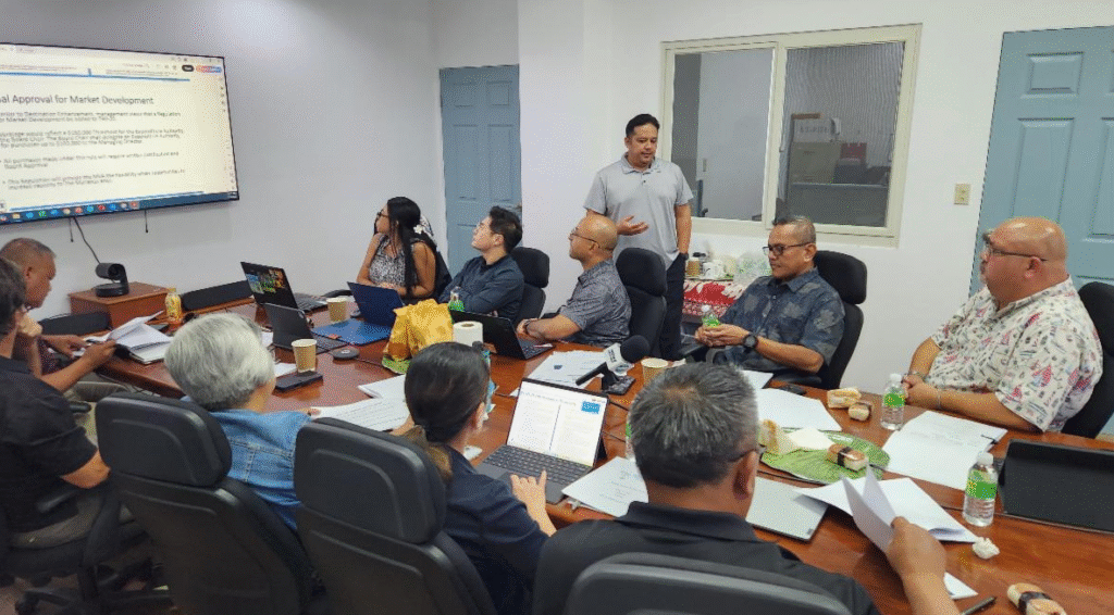 Marianas Visitors Authority Procurement Officer George Sablan, standing, discusses proposed changes to procurement regulations with the MVA Board of Directors on July 31, 2025, at the MVA office in I Liyan, Saipan.
