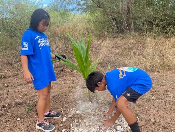Students of Tinian Elementary School plant 80 coconut seedlings on May 23, 2025, at the historic Tachibana Shinto Shrine on Tinian to mark Marianas Tourism Month.