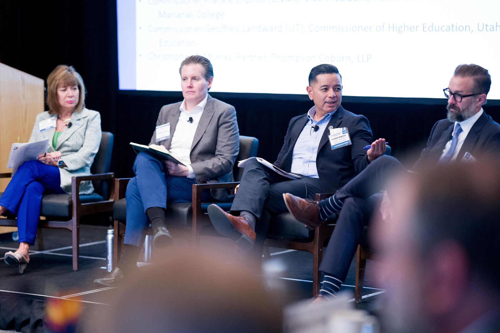 Northern Marianas College Vice President of Administration and Advancement Frankie Eliptico, 2nd right, joins other educational leaders at a Western Interstate Commission for Higher Education meeting on recent action related to higher education at the federal level and how they affect the region. The discussion also provided an opportunity for institutional, system, and state leaders to share how they are responding to the changes and to gain a deeper understanding of how federal and state/territory roles interact to support higher education goals. From left, Barbara Damron, chair of the Western Interstate Commission for Higher Education and professor, College of Nursing and School of Medicine, University of New Mexico; Christopher T. Murray, partner, Thompson Coburn LLP; Eliptico; and Geoffrey Landward, commissioner of higher education in Utah.
