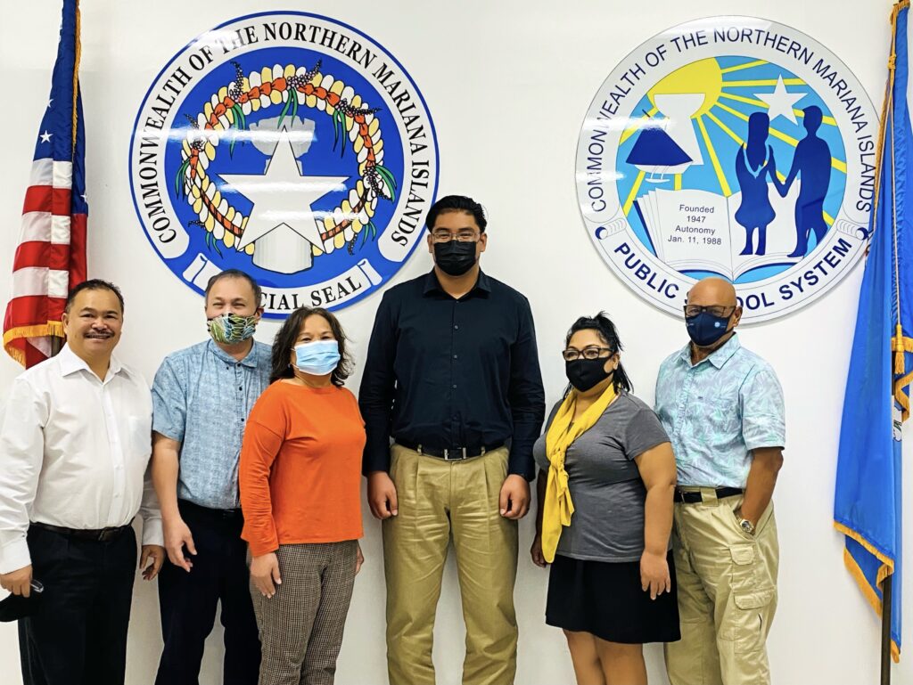 Antonio Borja of Tinian, third right, was sworn in Friday by Board of Education Chairwoman Janice Marie A. Tenorio, second right, as the new BOE member from Tinian. Borja was appointed by Gov. Ralph DLG Torres to succeed Philip Mendiola-Long who has resigned. Also in photo are BOE Vice Chairman Herman Atalig, right, board member MaryLou S. Ada, third left, board member Andrew Orsini, second left, and Commissioner of Education Dr. Alfred B. Ada, left. PSS photo